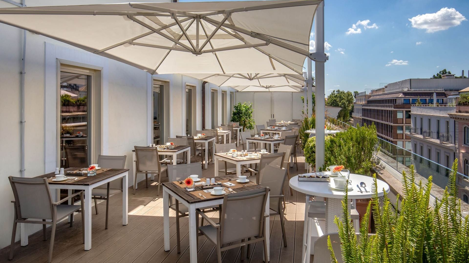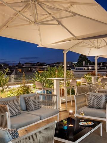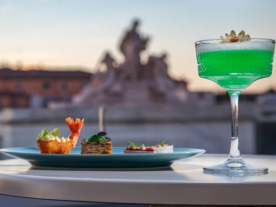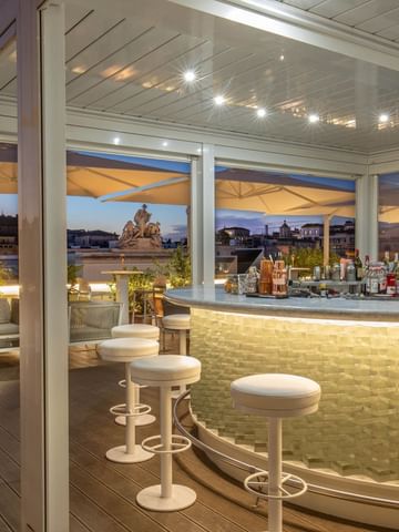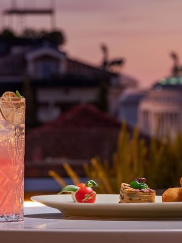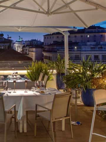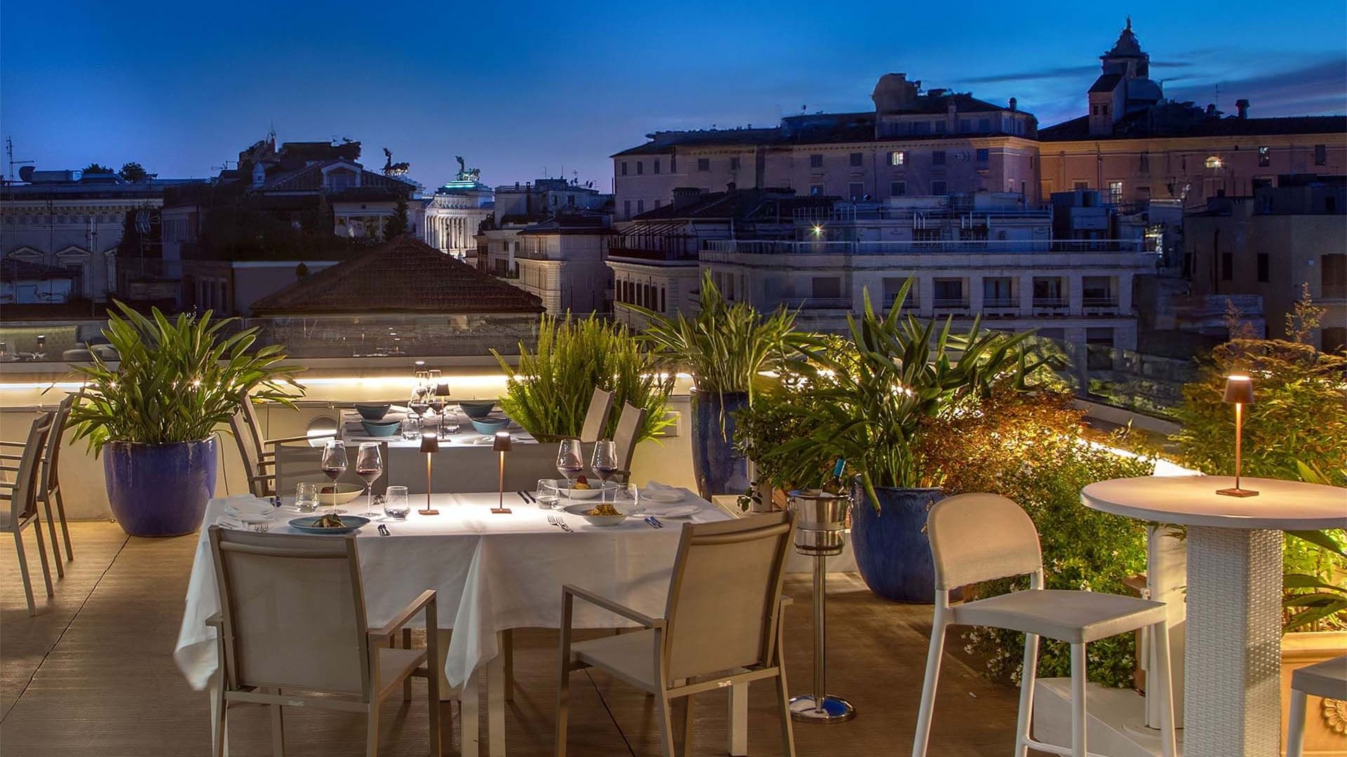 All’orizzonte buona parte della storia della Città Eterna. Un concentrato di eleganza e raffinatezza, luogo ideale per contemplare tutta la bellezza di Roma e sentirsi al centro di tutto tra pietanze ricercate, vini pregiati e buona musica.
