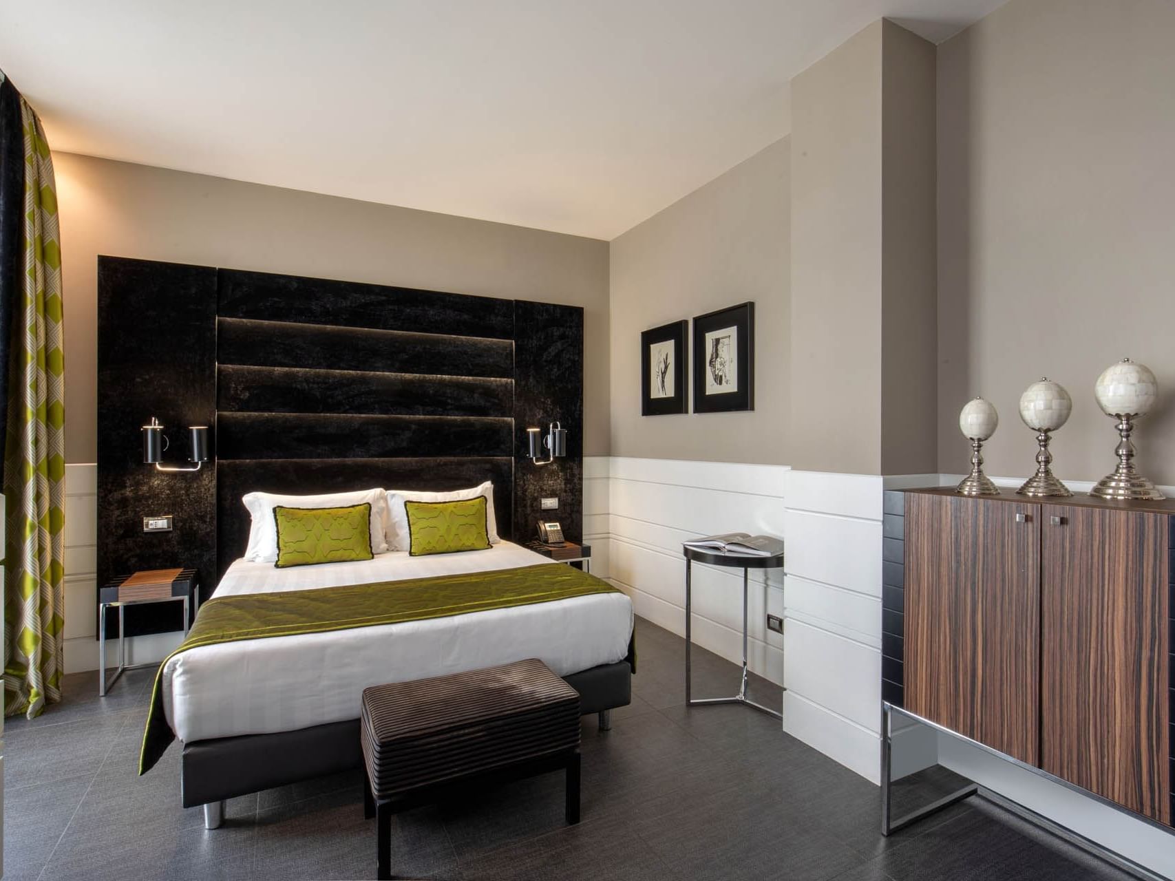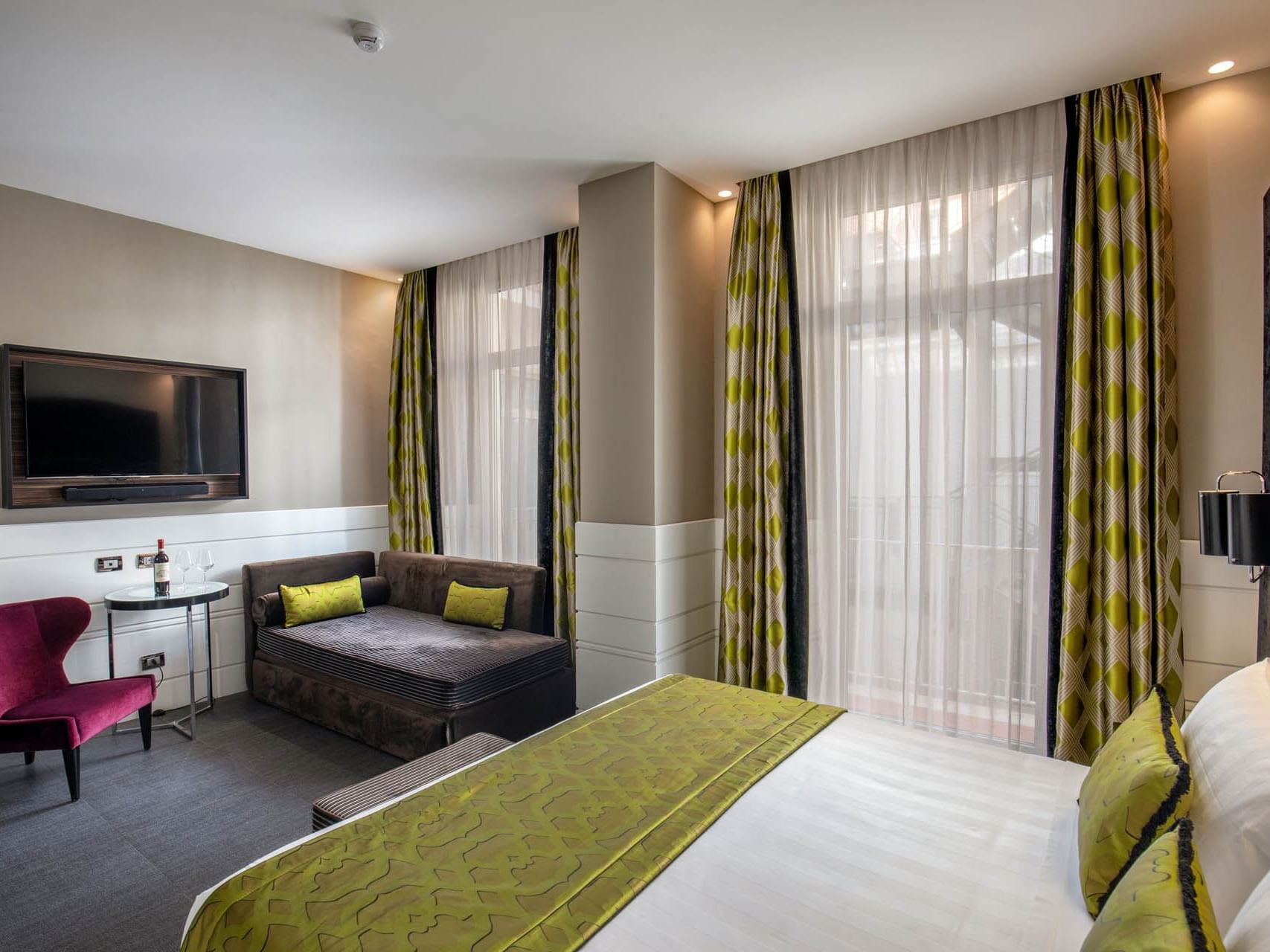 30 sqm of spacious and functional space make our Family Rooms the perfect choice for travelling families. The sleeping area offers a comfortable king-size bed or two single beds on request, with handcrafted headboards and dedicated reading lights, while a daybed adds practicality and comfort. The elegant marble bathroom, with a spacious shower or bathtub, is equipped with soft terry towels and an exclusive complimentary toiletries line. Each room is equipped with a concierge tablet