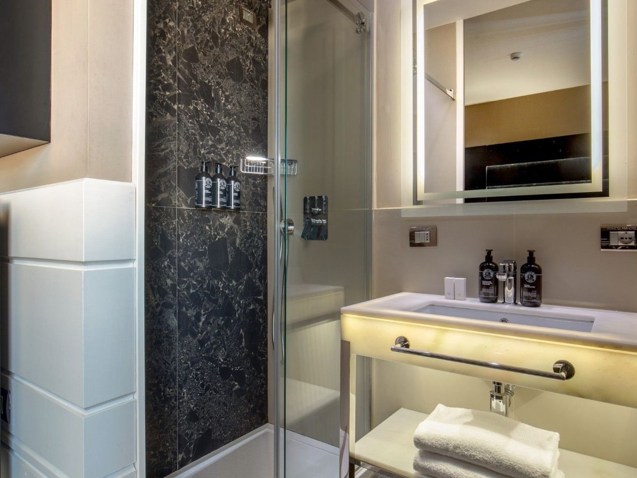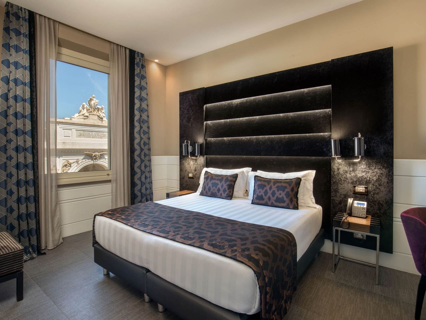 22 sqm of elegance and comfort greet you in our Superior Rooms, featuring modern, handcrafted furniture design. The sleeping area offers a large king-size bed or two single beds on request, equipped with high-quality hypoallergenic mattresses and handcrafted headboards with dedicated lighting. The refined and spacious marble bathroom includes a shower or bathtub, fluffy terry towels and an exclusive complimentary toiletries set. Each room is equipped with a concierge tablet